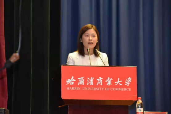 教师代表统计教研室主任田秀杰发言,她从树立自己的目标、根据自身实际做一个大学时期的人生规划、注意学习方式的转变,养成积极主动的思维习惯、养成良好的生活习惯,千万不要过于迷恋手机网络四个方面向新生提出希望,预祝新生秉承着“求真至善、修德允能”的校训,“商雅兼备,经世济民”的院训,在此度过人生中最有意义的四年美好时光。